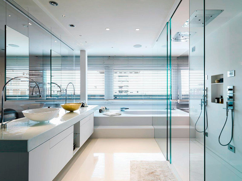 • Hacer divisiones de todo tipo para separar ambientes y colocar en ellas estanterías que, aparte de su gran utilidad, darán a su baño un nuevo aire de modernidad y estilo.